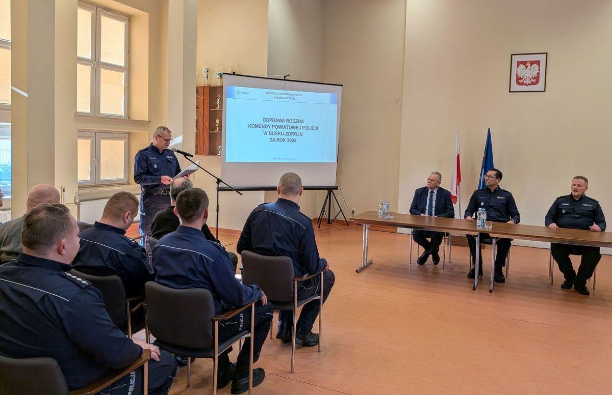W Komendzie Powiatowej Policji w Busku-Zdroju odbyła się uroczysta odprawa roczna, podsumowująca działania funkcjonariuszy w 2025 roku. Spotkanie z udziałem przedstawicieli kierownictwa Policji, samorządów oraz innych służb mundurowych zakończyło się oficjalnym przekazaniem nowoczesnych radiowozów, zakupionych dzięki wspólnemu wsparciu finansowemu samorządów i Policji.