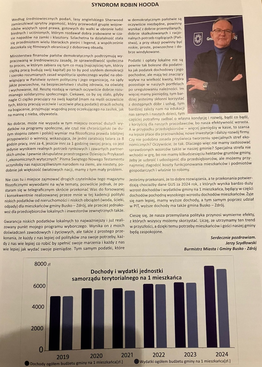 Jesteśmy przekonani, że to dobre rozwiązania, a te przekonania potwierdzają chociażby dane GUS za 2024 rok, z których wynika bardzo duży wzrost dochodów i wydatków gminy na 1 mieszkańca, będący w części dochodów pochodną wysokiego wzrostu dochodów mieszkańców. Żyje się nam lepiej, mamy wyższe dochody, a tym samym poprzez udział PIT wyższe dochody także gmina Busko-Zdrój.