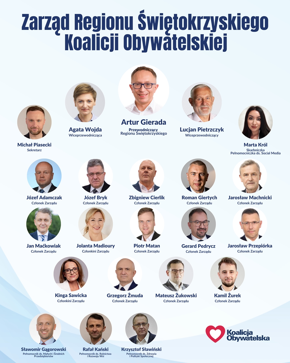 Rada Regionu wybrała także 13 pozostałych członków Zarządu. Wśród nich znaleźli się m.in. wojewoda świętokrzyski Józef Bryk, poseł Roman Giertych, radni wojewódzcy Jolanta Madioury i Gerard Pedrycz, radni Kielc Jarosław Machnicki i Kamil Żurek, a także przedstawiciele samorządów powiatowych: Kinga Sawicka i Piotr Matan. Uzupełnieniem składu są Jarosław Przepiórka, Grzegorz Żmuda, Mateusz Żukowski, Józef Adamczak i Zbigniew Cierlik. Do Zarządu wszedł również przewodniczący Klubu Radnych KO w sejmiku Jan Maćkowiak.